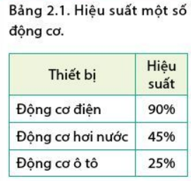 Câu 2: Với mỗi động cơ ở bảng 2.1, chỉ ra dạng năng lượng cung cấp, dạng năng lượng có ích tạo ra, dạng năng lượng hao phí tạo ra và biểu diễn dưới dạng lược đồ như hình 2.7.