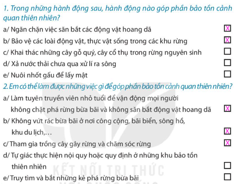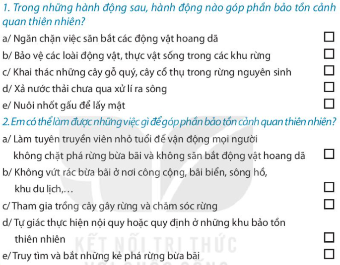 Đánh dấu X vào ô trống ở những phương án em chọn. Nếu là Nam, em sẽ làm gì. Nếu là Hưng em sẽ nói gì với Linh. Tham gia bảo tồn cảnh quan thiên nhiên ở nơi em sống và ghi lại. Những việc em đã làm. Cách em thực hiện. Viết đoạn văn ngắn để tuyên truyền, vận động những người sống quanh em tham gia bảo tồn cảnh quan thiên nhiên. Ghi lại những việc em đã làm để góp phần bảo tồn cảnh quan thiên nhiên và cảm xúc của em khi làm được những việc đó.