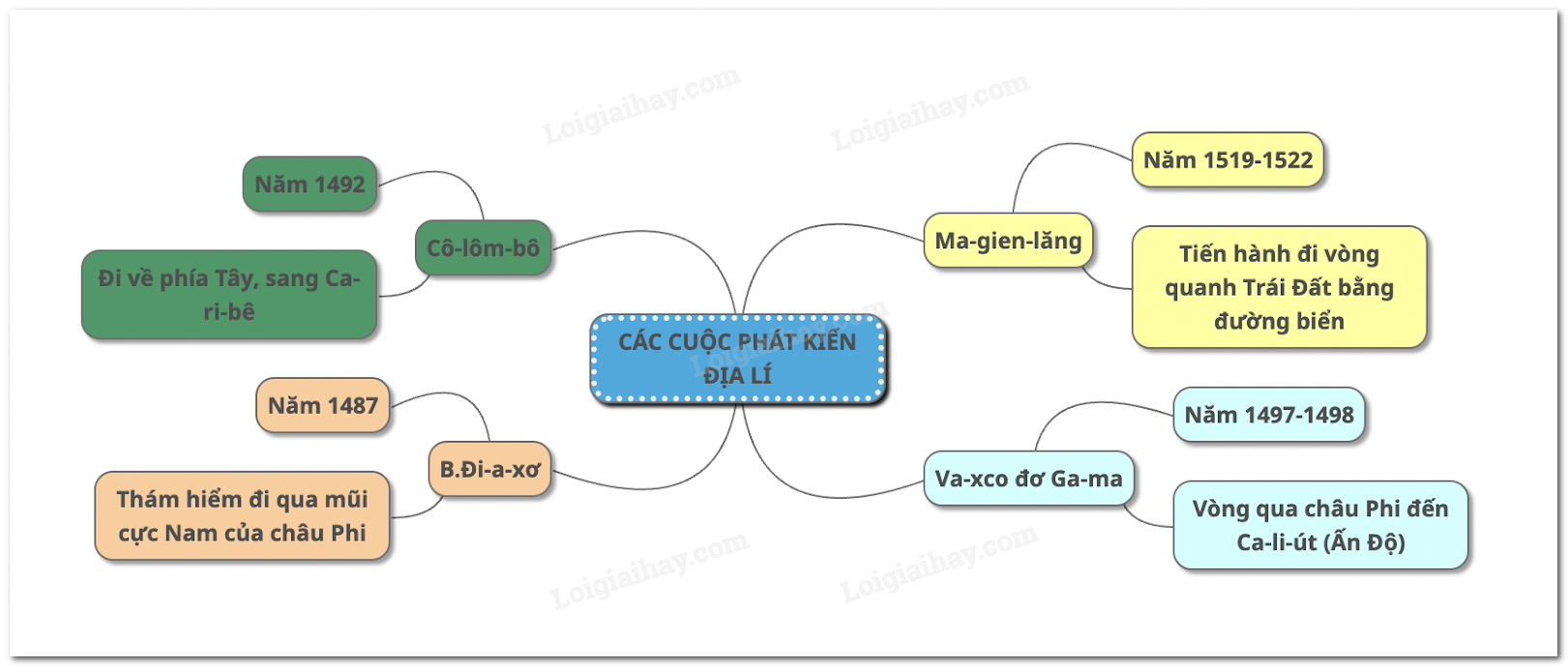 Sơ đồ tư duy thể hiện một số cuộc phát kiến địa lí lớn trên thế giới (thế kỉ XV-XVI):