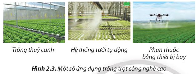 Quan sát vào hình 2.3 ta thấy 3 ảnh ghi lại các ứng dụng trồng trọt công nghệ cao là trồng thuỷ canh, hệ thống tưới tự động và phụ thuốc bằng máy bay.