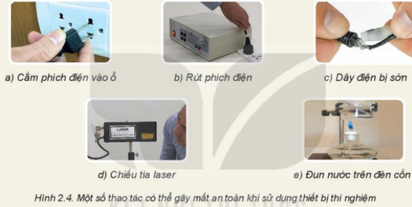 Em hãy quan sát một số hình ảnh về thao tác sử dụng các thiết bị thí nghiệm trong hình 2.4 và dự đoán xem có những nguy cơ nào có thể gây nguy hiểm trong phòng thực hành vật lí?