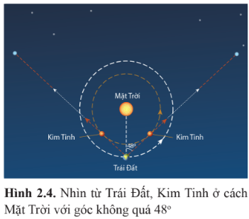 Dựa vào hình 2.4, giải thích chuyển động nhìn thấy của Kim Tinh: Nhìn từ Trái Đất, Kim Tinh ở cách Mặt Trời với góc không quá 480