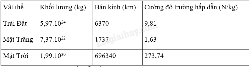 Ta có cường độ trường hấp dẫn Trái Đất là: \({g_{TD}} = \frac{{G{M_{TD}}}}{{{R_{TD}}^2}} = 9,81N/kg\)