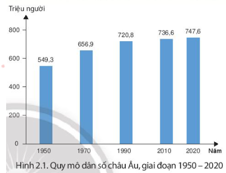 + Quy mô dân số châu Âu trong giai đoạn 1950 – 2020 có xu hướng tăng qua các năm: Năm 2020, dân số châu Âu đạt khoảng 747,6 triệu người (chiếm gần 10% dân số thế giới).