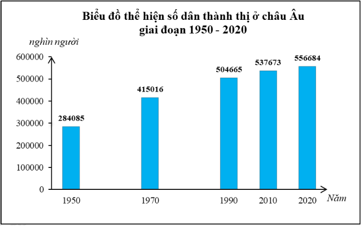 Dựa vào bảng số liệu dưới đây, hãy vẽ biểu đồ thể hiện số dân thành thị hoặc tỉ lệ dân thành thị ở châu Âu giai đoạn 1950 – 2020 và rút ra nhận xét.
