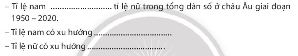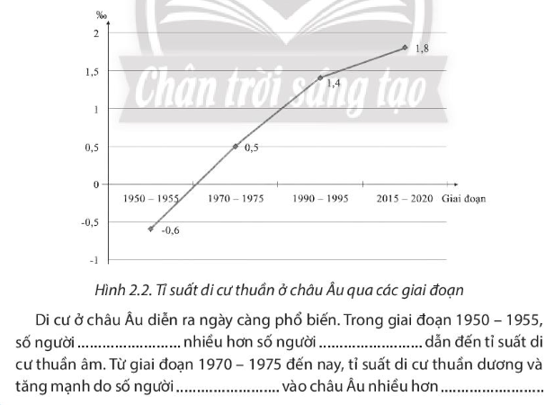 Nhận xét xu hướng tăng dân số châu Âu trong giai đoạn 1950 – 2020. Nhận xét và giải thích sự thay đổi cơ cấu dân số theo nhóm tuổi ở châu Âu trong hai năm trên. Dựa vào hình 2.2 dưới đây, hãy điền từ “nhập cư” hoặc “xuất cư” vào chỗ trống (…) trong đoạn văn dưới đây cho phù hợp. Dựa vào bảng số liệu dưới đây, hãy vẽ biểu đồ thể hiện số dân thành thị hoặc tỉ lệ dân thành thị ở châu Âu giai đoạn 1950 – 2020 và rút ra nhận xét.