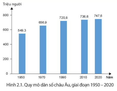 Dựa vào hình 2.1 và thông tin trong bài, em hãy nhận xét sự thay đổi quy mô dân số châu Âu trong giai đoạn 1950 – 2020.