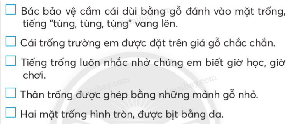 Cái trống trường em được đặt trên giá gỗ chắc chắn. Thân trống được ghép bằng những mảnh gỗ nhỏ. Hai mặt trống hình tròn được bịt bằng da. Bác bảo vệ cầm cái dùi bằng gỗ đánh vào mặt trống, tiếng “tùng, tùng, tùng” vang lên. Tiếng trống luôn nhắc nhở chúng em biết giờ học, giờ ra chơi.