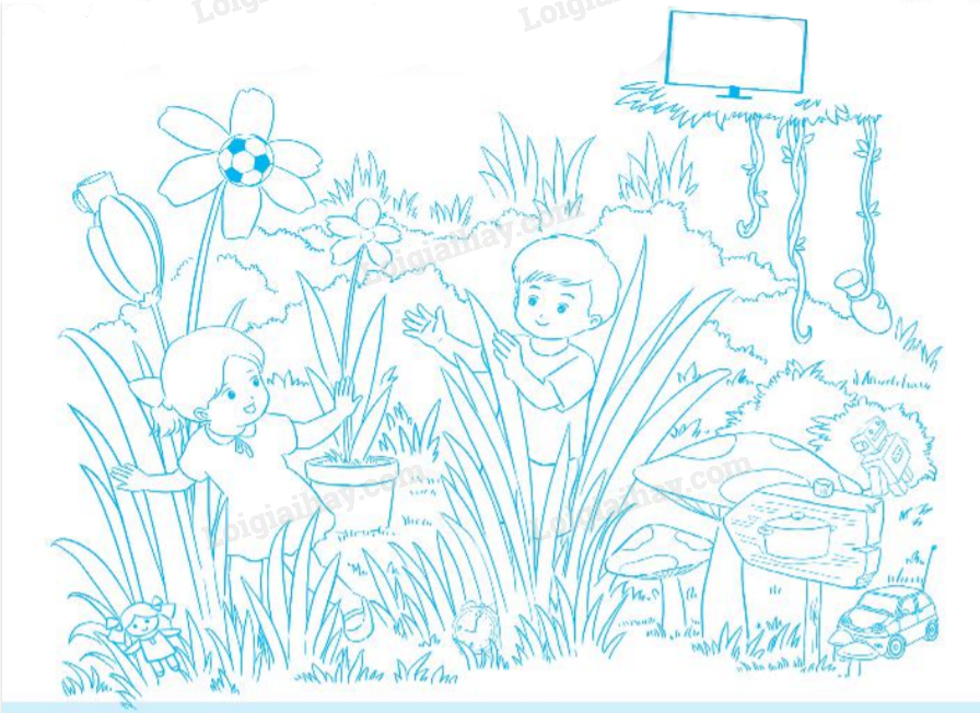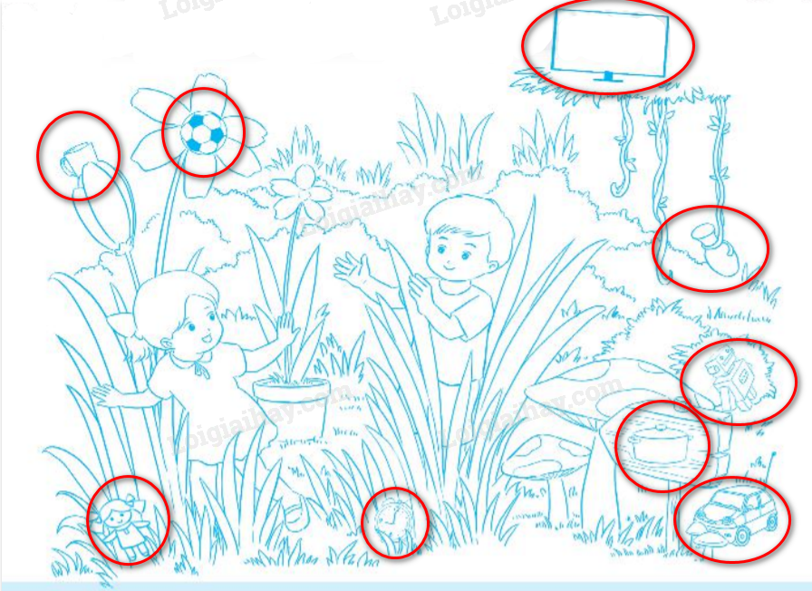 Em quan sát kĩ bức tranh và khoanh tròn các đồ vật có trong đó, gọi tên các đồ vật ấy và sắp xếp chúng vào nhóm phù hợp.