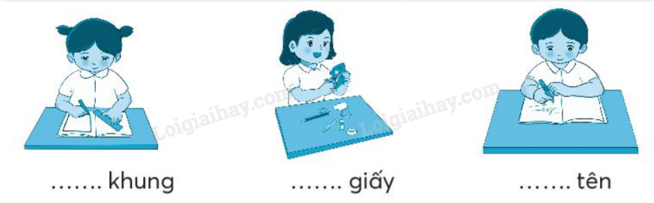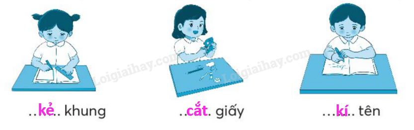 Em quan sát từng hình, chú ý hoạt động của các bạn học sinh để viết tiếng phù hợp.