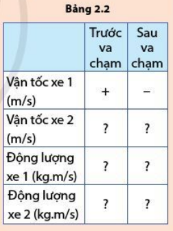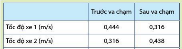 Từ kết quả thí nghiệm của mình, bạn hãy tính động lượng của các xe trước và sau va chạm. So sánh độ thay đổi động lượng của xe 1 và xe 2.