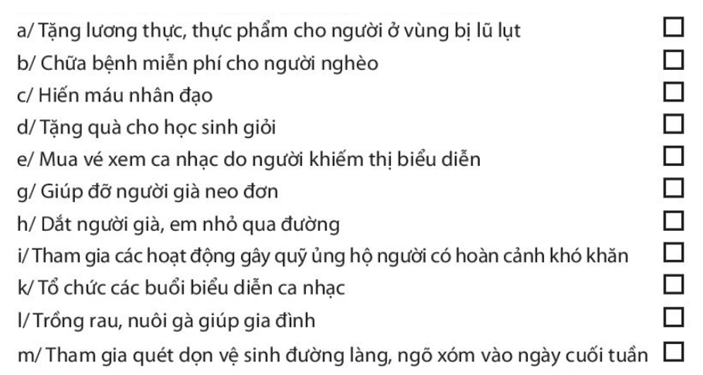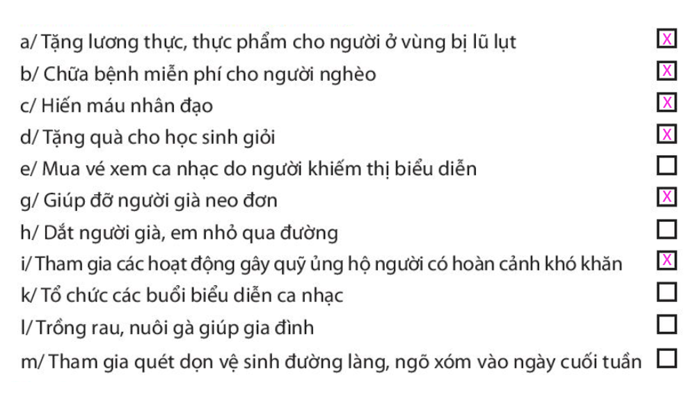 Hoạt động nào dưới đây là hoạt động thiện nguyện. Đánh dấu X vào ô trống ở những phương án em chọn. Viết nội dung phù hợp vào các ô trong bảng sau. Gần nhà Hải có một gia đình bác thương binh có hai con đều bị nhiễm chất độc màu da cam, cuộc sống rất khó khăn chật vật. Nếu là Hải, em sẽ làm gì để giúp gia đình đó.