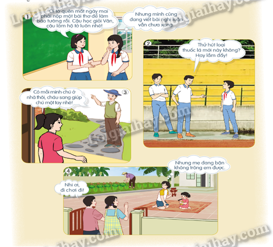 * Tình huống 4: Bạn nữ đang trông em cho mẹ làm việc mà lại có bạn rủ đi chơi, nên từ chối vì mẹ đang bận làm việc còn em nhỏ cần người chăm sóc,…