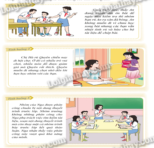 Tình huống 1: Em sẽ từ chối, vì chưa làm xong bài tập và ngay mai kiểm tra nên cần ôn kĩ, hẹn bạn dịp khác