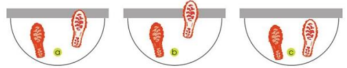 + Hai chân thẳng, thân người hơi ngả về trước, hai tay duỗi thẳng về hướng rổ, lòng bàn tay hướng sang hai bên.