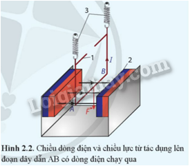 – Khi có dòng điện chạy qua khung dây theo chiều từ A đến B, khung dây bị kéo thẳng đứng xuống dưới. Điều này cho thấy, lực từ tác dụng lên AB có phương thẳng đứng, vuông góc với cả đoạn dòng điện AB và đường sức từ (Hình 2.2).