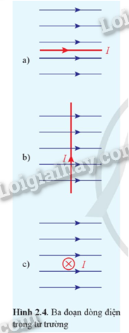 Trường hợp nào trong Hình 2.4 có lực từ tác dụng lên đoạn dòng điện? Tìm phương và chiều của lực từ trong trường hợp đó.