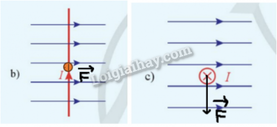 Áp dụng quy tắc bàn tay trái ta thấy có trường hợp b) và c) là có lực từ tác dụng lên đoạn dây dẫn, trong trường hợp a) chiều của đường sức từ hợp với dòng điện một góc 0o do đó không có lực từ tác dụng lên dây trong trường hợp này hay lực tác dụng lên dây: F = 0N.
