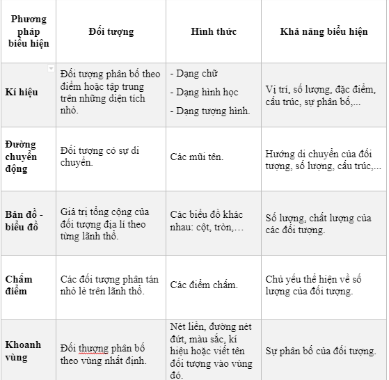Lập bảng để phân biệt một số phương pháp biểu hiện các đối tượng địa lí trên bản đồ (về đối tượng, hình thức, khả năng biểu hiện của phương pháp).