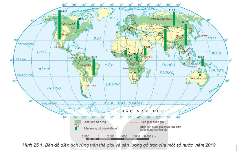Cho biết phương pháp đã được sử dụng để thể hiện diện tích rừng trên thế giới và sản lượng gỗ tròn của một số nước năm 2019 ở bản đồ hình 25.1 trang 74 SGK