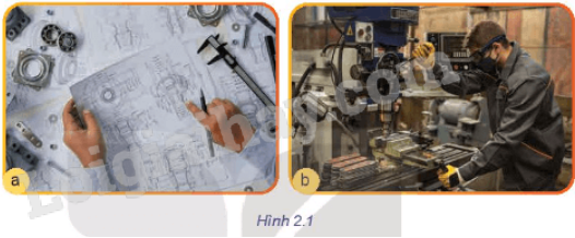 Hình 2.1 thể hiện những công việc của một số ngành nghề trong lĩnh vực cơ khí chế tạo. Hãy mô tả và nêu ý nghĩa của công việc trong Hình 2.1a và Hình 2.1b; trong hai công việc đó, em phù hợp với ngành nghề nào hơn?