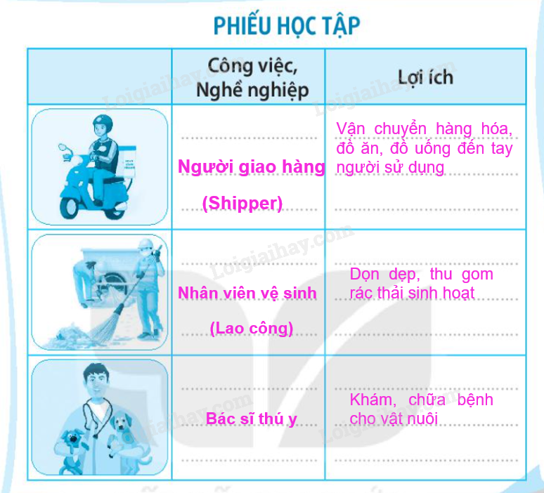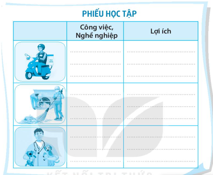 Hãy viết lợi ích của các nghề nghiệp, công việc trong mỗi hình vào chỗ (…) dưới đây. Nối cột A với cột B cho phù hợp về công việc, nghề nghiệp. Lựa chọn từ/cụm từ trong khung điền vào chỗ (…) để hoàn thành đoạn văn sau. Quan sát các hình dưới đây và hoàn thành Phiếu học tập sau. Nếu em là Vân, trong tình huống sau, em sẽ nói gì với Hoa