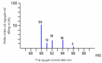 Cho phổ khối của nguyên tố A được biểu diễn tại hình 1.33, Nguyên tử khối trung bình của A là
