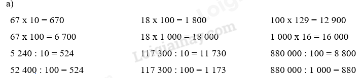 b) Lấy một ví dụ và nói cho bạn nghe cách thực hiện nhân một số với 10, 100, 1 000,…; chia một số cho 10, 100, 1 000,…