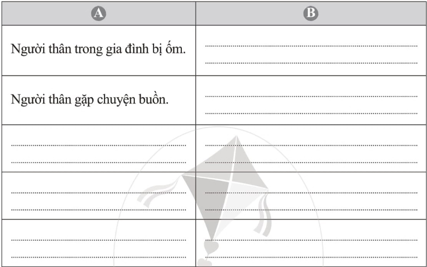 Xác định và mô tả tình huống cần sự quan tâm vào cột A và cách thức quan tâm, chăm sóc người thân trong các tình huống đó vào cột B.