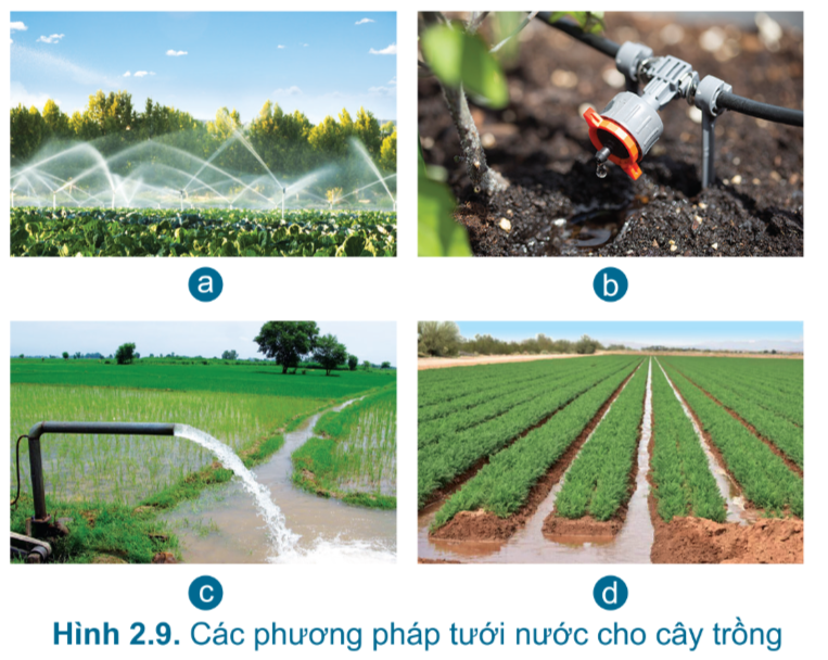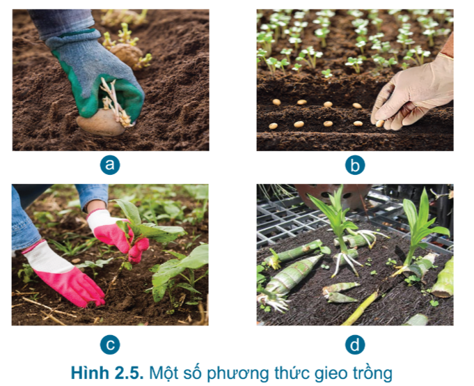 Quan sát Hình 2.5 và đọc mục 2.2, ta thấy có 3 phương thức gieo trồng: gieo hạt, trồng bằng hom, củ, trồng bằng cây con