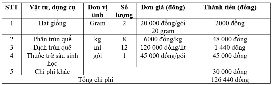 Để trồng và chăm sóc 10 m2 cây cải xanh trong thùng xốp cần: 2 gram hạt giống, 8 kg phân trùn quế, phun dịch trùn quế cho rau 4 lần mỗi lần 3 ml, 1 gói thuốc trừ sâu sinh học để phòng trừ sâu bệnh, chi phí khác là 30 000 đồng. Biết: giá hạt giống cải xanh là 20000 đồng/gói 20 gram, giá phân trùn quế là 6 000 đồng/kg, giá dịch trùn quế là 120 000 đồng/lít, giá thuốc trừ sâu sinh học là 45 000 đồng /gói.