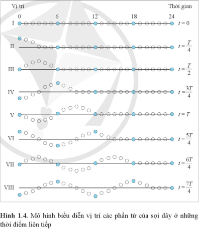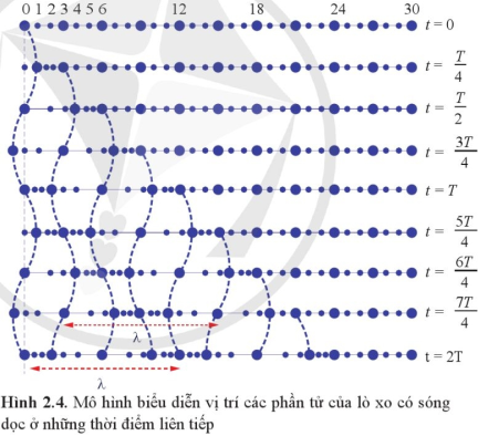 Quan sát mô hình biểu diễn vị trí các phần tử của lò xo ở những thời điểm liên tiếp.