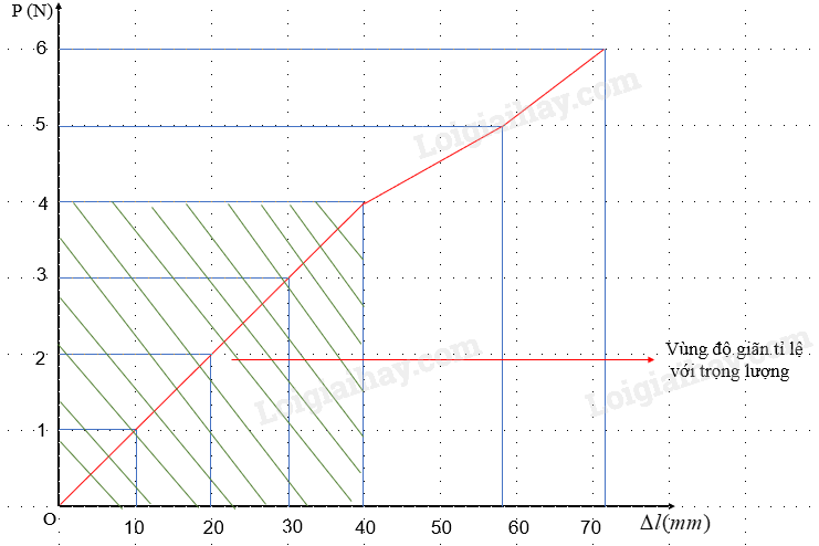 e) Vùng nào trên đồ thị là vùng mà độ giãn tỉ lệ với trọng lượng?