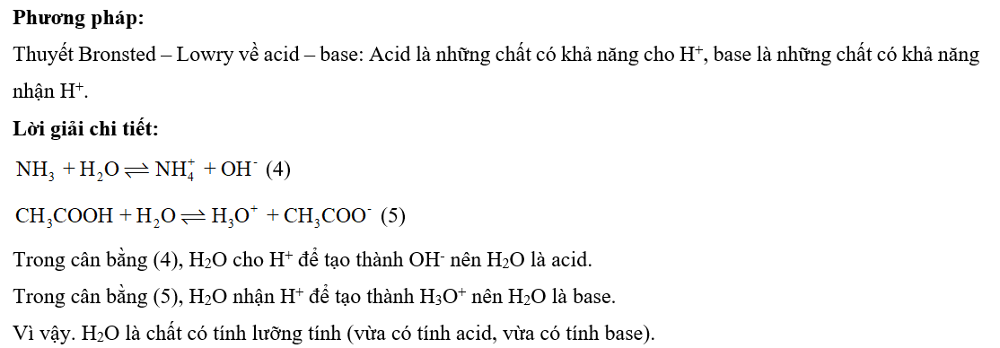 Câu hỏi 3: Dựa vào cân bằng (4) và (5), hãy giải thích vì sao H2O được cho là chất có tính lưỡng tính (là chất vừa có tính acid, vừa có tính base).