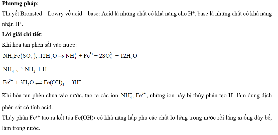 Câu hỏi 1: Tương tự Ví dụ 5, hãy cho biết dung dịch phèn sắt (NH4 Fe(SO4)2.12H2O) có môi trường acid hay base. Giải thích. Vì sao người ta có thể dùng phèn sắt để loại bỏ các chất lơ lửng trong nước?
