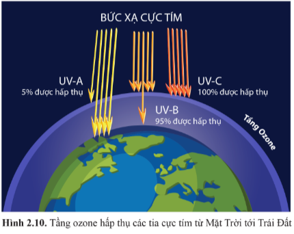 – Quan sát hình 2.10 và mô tả khả năng hấp thụ của các bức xạ cực tím UV-A, UV-B, UV-C của tầng ozone.