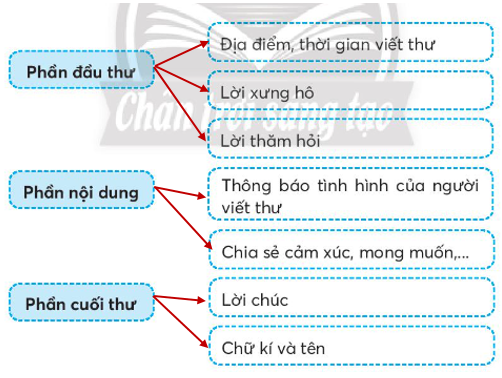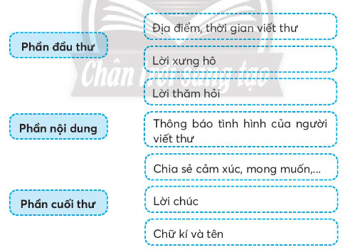 Đọc lại bài Thư thăm bạn (SGK, tr 107), cho biết mỗi phần của bức thư gồm những nội dung gì. Nối các thẻ cột B phù hợp với mỗi thẻ cột A. Hoàn thành sơ đồ tìm ý cho những nội dung em muốn viết trong bức thư gửi một người bạn ở xa.