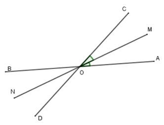 Mà \(ON\) và \(OM\) là hai tia đối nhau nên \(\widehat {AOM}\) và \(\widehat {BON}\) là hai góc đối đỉnh; \(\widehat {COM}\) và \(\widehat {DON}\) là hai góc đối đỉnh