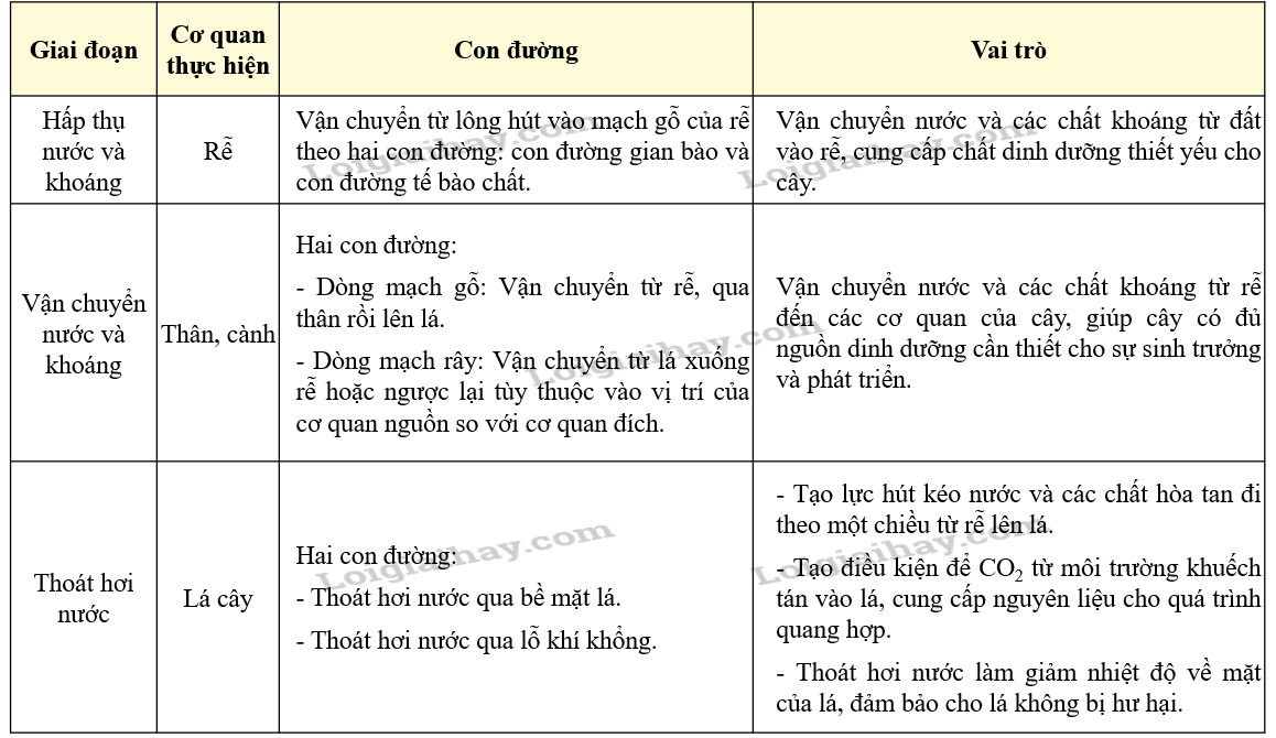 Nước và các nguyên tố khoáng được hấp thụ vào bằng các cách: