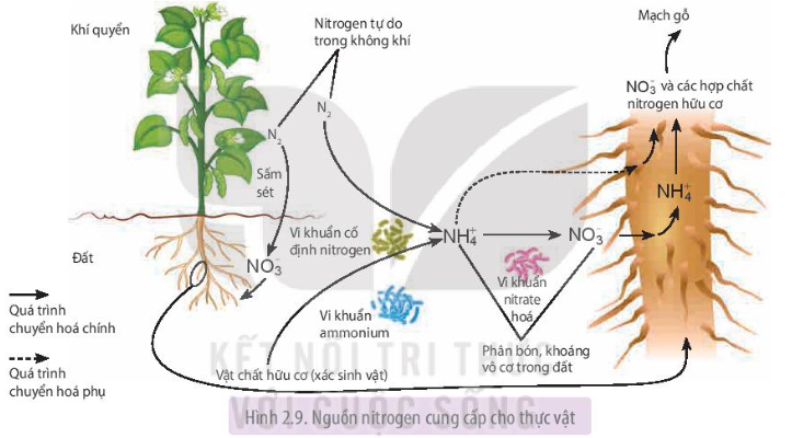 Dựa vào sơ đồ Hình 2.9, kể tên các nguồn cung cấp nitrogen cho cây. Cho biết thực vật có thể sử dụng trực tiếp nitrogen tự do có trong không khí hay không?