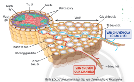| Quan sát Hình 2.5, hãy mô tả con đường hấp thụ, vận chuyển nước và muối khoáng từ môi trường đất vào mạch gỗ của rễ. |