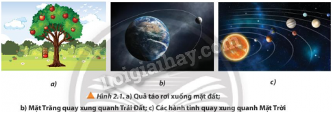 Quả táo rơi xuống mặt đất (Hình 2.1a), Mặt Trăng quay xung quanh Trái Đất (Hình 2.1b), các hành tinh lại quay xung quanh Mặt Trời (Hình 2.1c). Tại sao quả táo rơi xuống đất khi rời cành cây? Tại sao Mặt Trăng và các hành tinh có thể duy trì được quỹ đạo chuyển động của chúng?