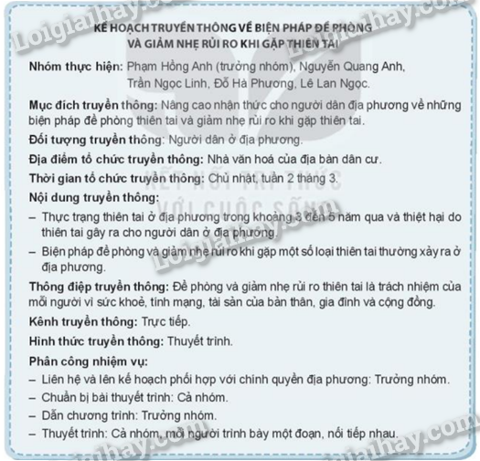 Phương pháp giải: Dựa vào gợi ý và lập một kế hoạch truyền thông về biện pháp đề phòng thiên tai và giảm nhẹ rủi ro khi gặp thiên tai.