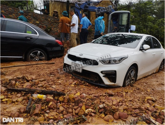 Bùn đất kèm sỏi đá tràn xuống trong lúc nhiều ô tô của khách nghỉ dưỡng đang đỗ dọc tuyến đường. Sự cố khiến nhiều ô tô mắc kẹt, “chôn chân” tại chỗ.