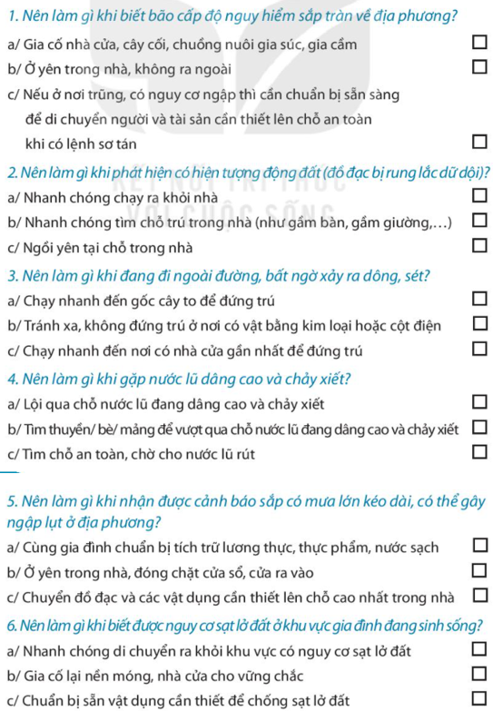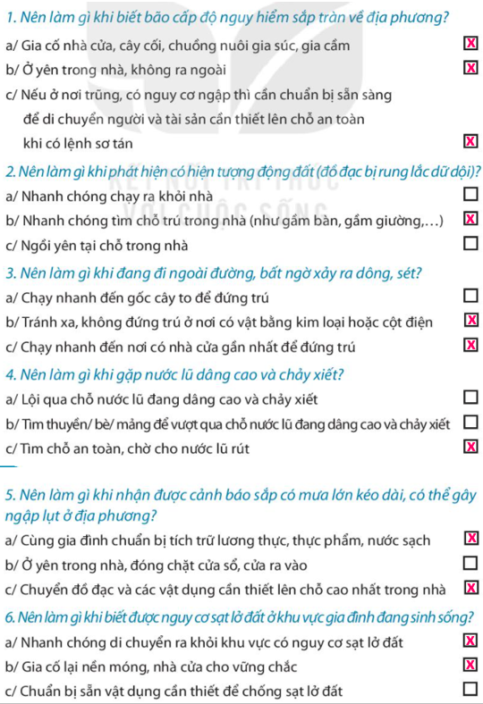 Hãy viết dấu hiệu đặc trưng của mỗi loại thiên tai dưới đây. Đánh dấu X vào ô trống ở những phương án em chọn. Hãy nêu hành động tự bảo vệ bản thân của em khi gặp mỗi tình huống thiên tai dưới đây. Ghi lại và chia sẻ với bạn bè về. Những việc em đã làm để bảo vệ an toàn khi thiên tai xảy ra. Những hành động em đã rèn luyện để tự bảo vệ bản thân trong một số tình huống thiên tai.