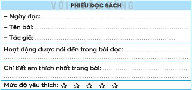 Đọc văn bản Đi tàu Thống Nhất hoặc tìm đọc câu chuyện, bài văn, bài thơ,… viết về những hoạt động yêu thích của trẻ em và viết thông tin vào phiếu đọc sách.