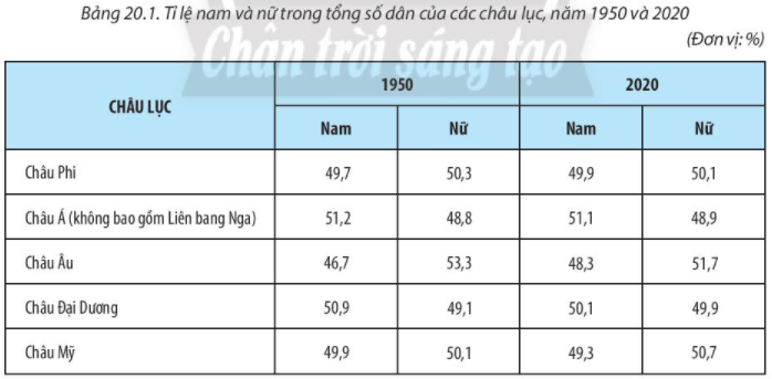 – Tỉ lệ nam và nữ trong tổng số dân của các châu lục, năm 1950 và 2020 đều có sự chênh lệch (lấy dẫn chứng số liệu trong bảng):