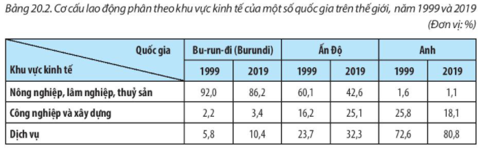 Dựa vào bảng 20.2, em hãy vẽ biểu đồ thể hiện cơ cấu lao động phân theo khu vực kinh tế của bu-run-đi, Ấn Độ và Anh, năm 2019.