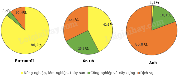 + Vẽ 3 biểu đồ tròn lần lượt thể hiện cơ cấu lao động phân theo khu vực kinh tế của bu-run-đi, Ấn Độ và Anh, năm 2019.