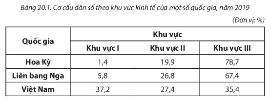 Cơ cấu dân số phân theo khu vực kinh tế của Hoa Kỳ, LBN và Việt Nam năm 2019 có sự khác nhau: